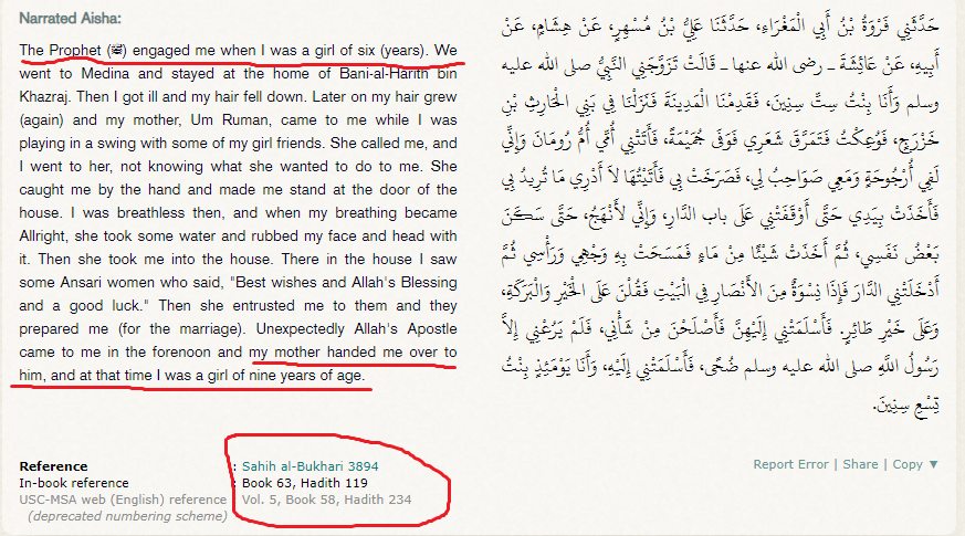 if you increase her age to 16 or 21 as you claim you contradict ali. we all know aisha was muslim when she married to mohammad and ali became muslim at age 10 in 609. according to your source if she married at age of 16 then she born at 603 or 604 and if she married at age 21 she would be born at 593 to 592 basically she born before ali lol you are making aisha the first muslim instead of ali