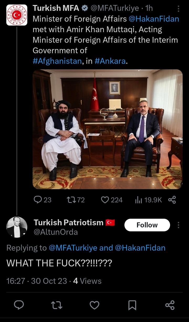 Ignoring Taliban because of "human rights" and shit like that is not a thing that any government is going to do as well. Westerners will use it as a tool, to control the Afghani opposition and have it as a trump card to pressure them whenever they want, but nobody should expect Turkey to condemn Taliban for "human rights", as such an act serves no purpose from our pov. The small European countries that do such things, only do so to solidify their place in the ranks of U.S. vassals.