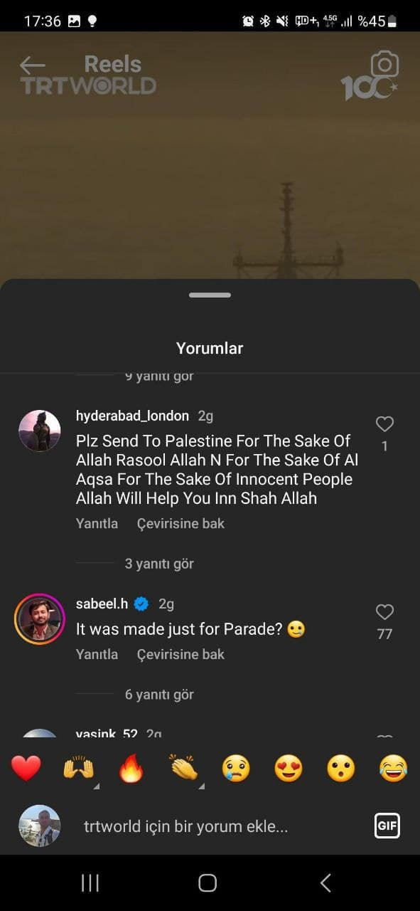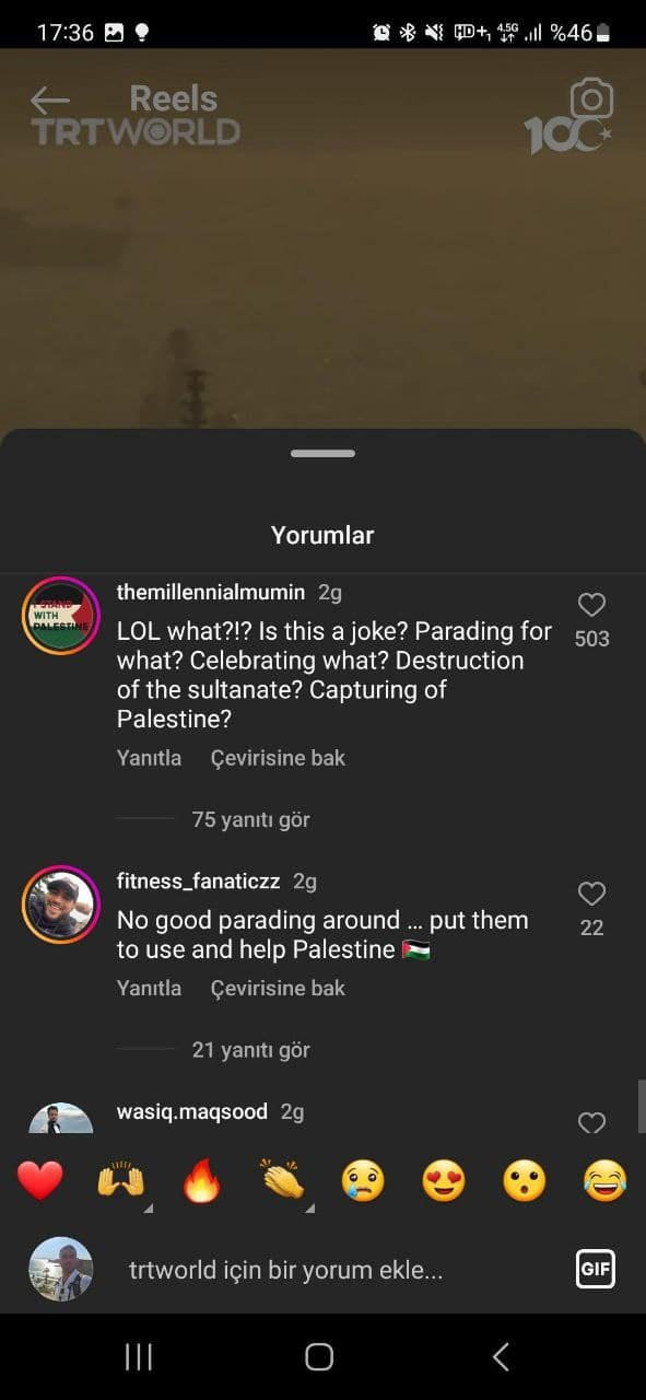 Filistinlilerin TRT world instagram hesabında 100. Yıl donanma geçit töreninde yaptıkları yorumlar.