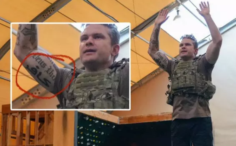 After the crazy evangelical lady and Secretary Rubio with a cross on her forehead, another colorful character has appeared on Trump's team - Defense Secretary Hegseth. He has fresh tattoos on his arm with the text "So God Decided." Below it is written in Arabic "kafir."