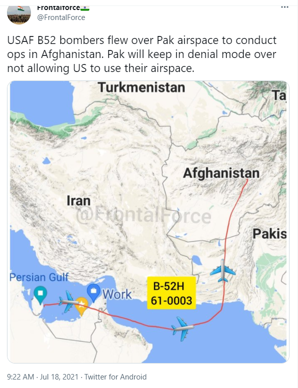 There will be flights by USAF over Pak airspace until September 2021 per the agreement. However there is no basis to say these are combat flights and any such claims are just Indian propaganda. At this critical juncture Pakistan would be suicidal to allow combat flights knowing it would lead to Taliban reaction. US also has ceased all combat operations against Taliban as the latter do not target any NATO/US forces.