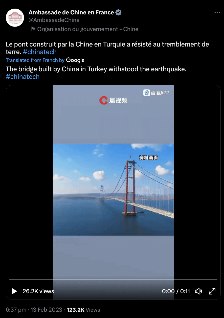 Twitter is full of rumors, fake news and blatant lies. Newest dumbest story: The Chinese embassy in Paris and a Chinese general consul in Belfast tweeted videos how Chinese-built 1915 Çanakkale bridge withstood the earthquake in Türkiye.