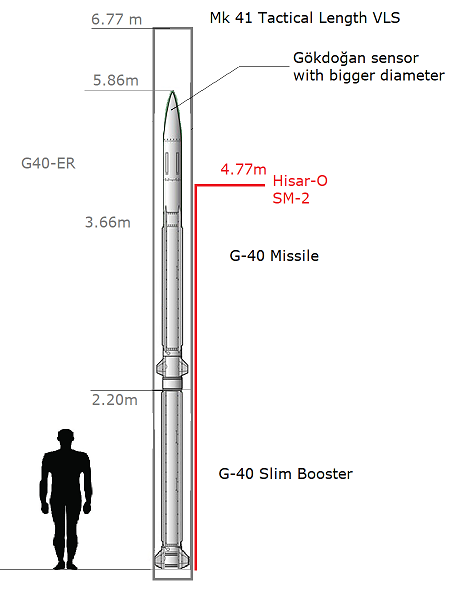G40-ER dimensions compared with tactical length Mk 41 VLS if the rocket motor inside the missile or a similar length motor is used as a booster. I don't expect this kind of experiment with close fitting until booster tech and two stage is mature enough for us though. There are small errors and width is not considered for VLS cell, but gives an idea.