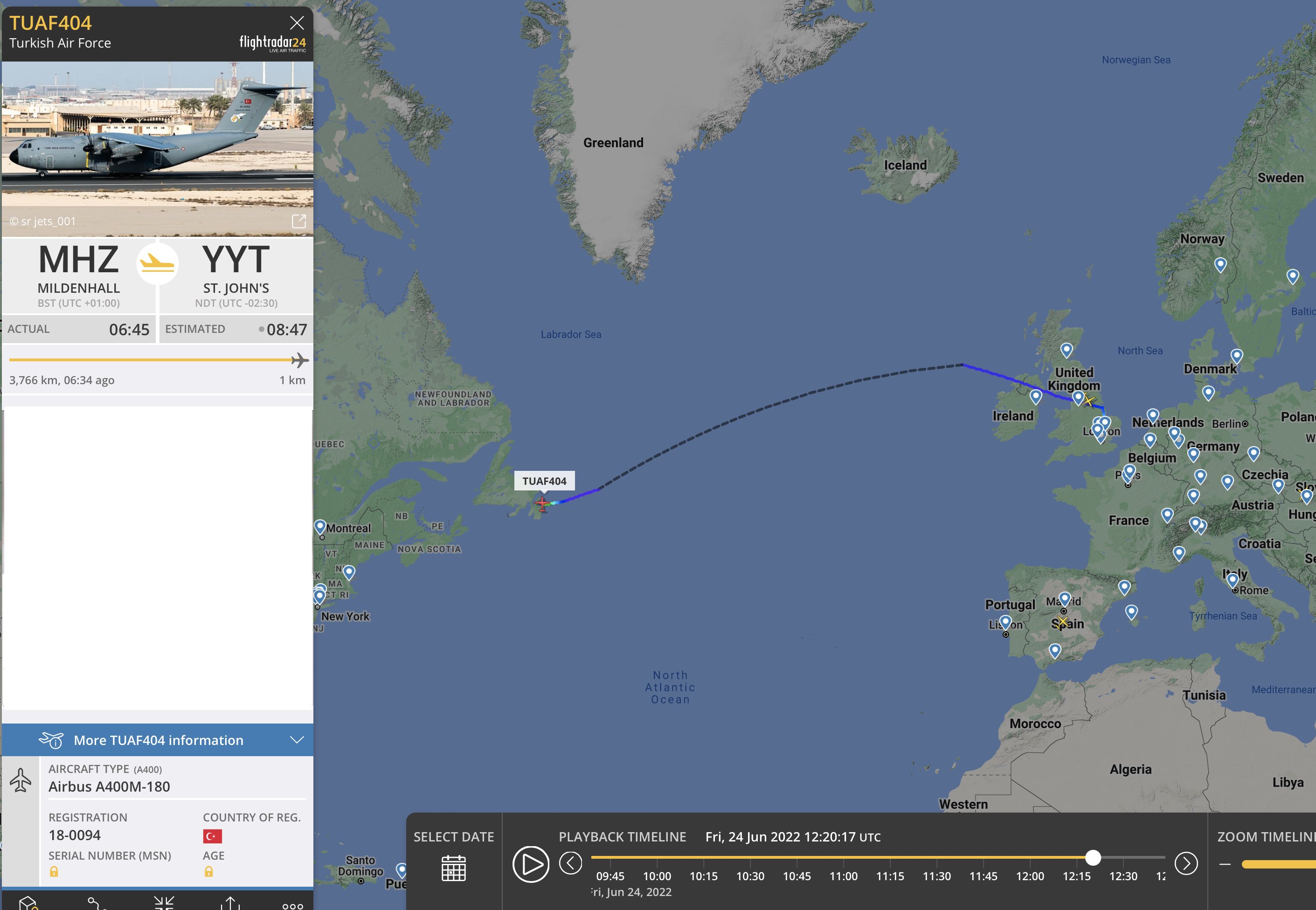 Something else I noticed the A400M flew from Mildenhall to St. Johns which is 2048NM (3755KM) which means it was loaded with something.