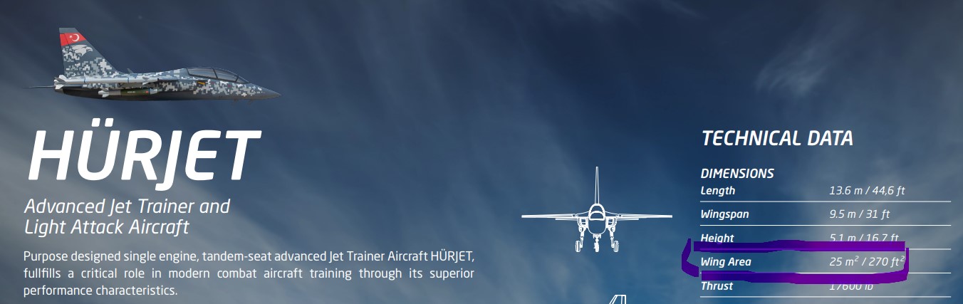 Anyhow, I have figured out the inconsistency in Wing Area between the TAI's official information for Hurjet on their website and on their official broucher. It seems like some dumb employee fails to correctly convert the numbers in the imperial system into the metric system. Wing Area of Hurjet is 270 ft2 and the figure consists with the figure both on the broucher and on the website.