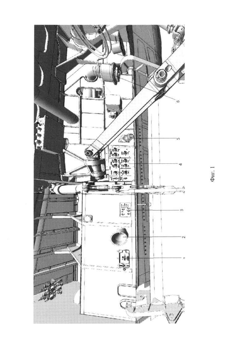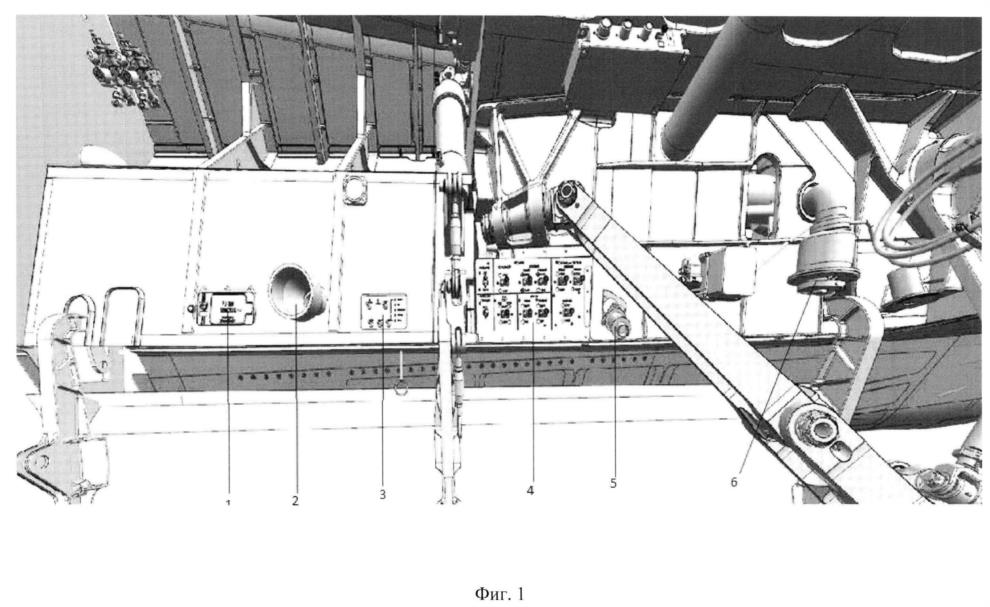 Figure 1 shows a view of the landing gear and aircraft maintenance units (example), located in its niche, where 1 is the connection point for a ground-based power supply source, 2 is the connection point for a ground-based air conditioning source, 3 is a ground-based weapons preparation console, 4 is a control panel. cargo compartment doors, 5 - closed engine oil filling fitting, 6 - centralized fuel filling fitting.