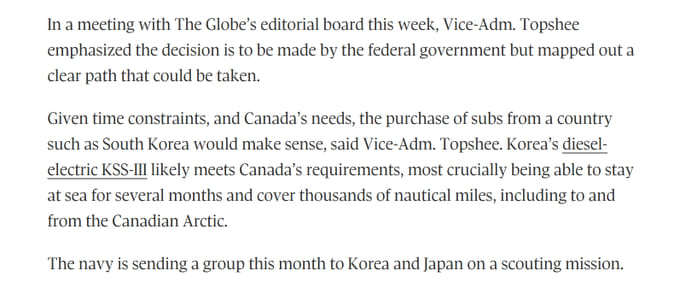 So it appears things are moving towards the selection of a design for the next class of submarines for the RCN which will succeed the Victoria Class. Later this month members of the submarine replacement project will travel to Japan and Korea to look at the Korean KSS-III and presumably the Sōryū-class. Both classes leverage the lithium battery technology and AIP. While not powerful enough to surface or operate exclusively under the ice would give the RCN certainly ice edge capability. Any variants would have to be heavily modified to operate combat systems the RCN would want to acquire and modify the boats to operate in the Arctic. This is good news however realistically any new class is over 15 years away. View attachment 57166