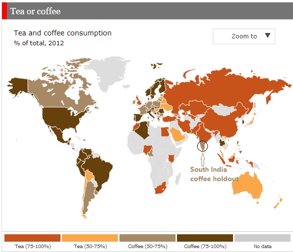 The world reference map for preferences (taken from pew research with my informed editing w.r.t south india..i feel we are somewhere in the 66% coffee preference range, but could be even 75%+...but we get "oranged" by the whole larger northern country population dominant preference for tea on unaltered maps)