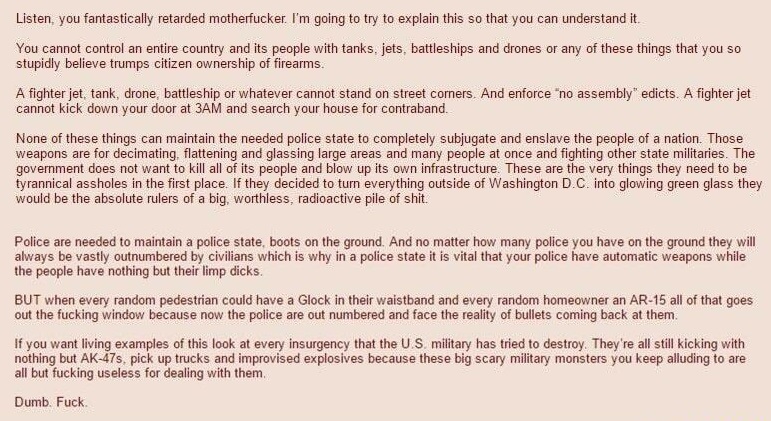 All this talk reminds me of one thing due to advanced weapon technology we underestimate peoples will with a gun.