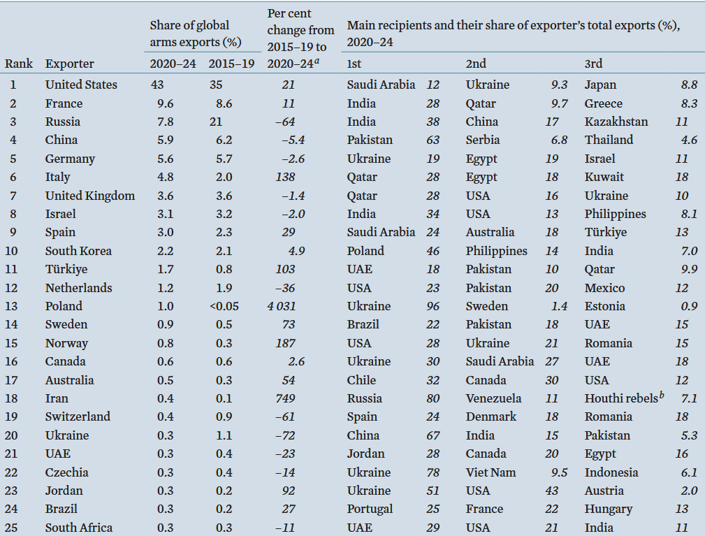 From the current 1.7% and 11th position I am guessing we can get to the 6th position with 5% in the next 5 years by the end of 2030 which requires 24% year over year increase for 5 years. This means nearly 3 times the current values. This can peak by 2035 when we hit 8% and 4th position. Table is SIPRI arms transfer list.