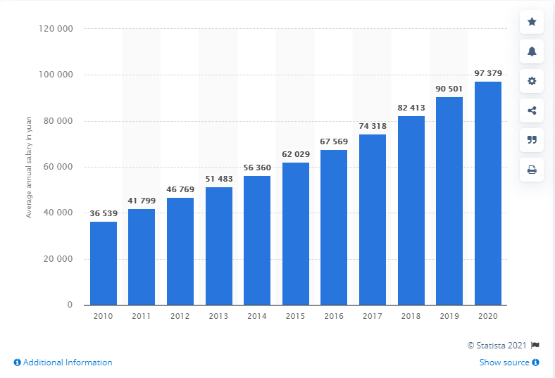 Average annual salary of an employee in China 2010-2020​