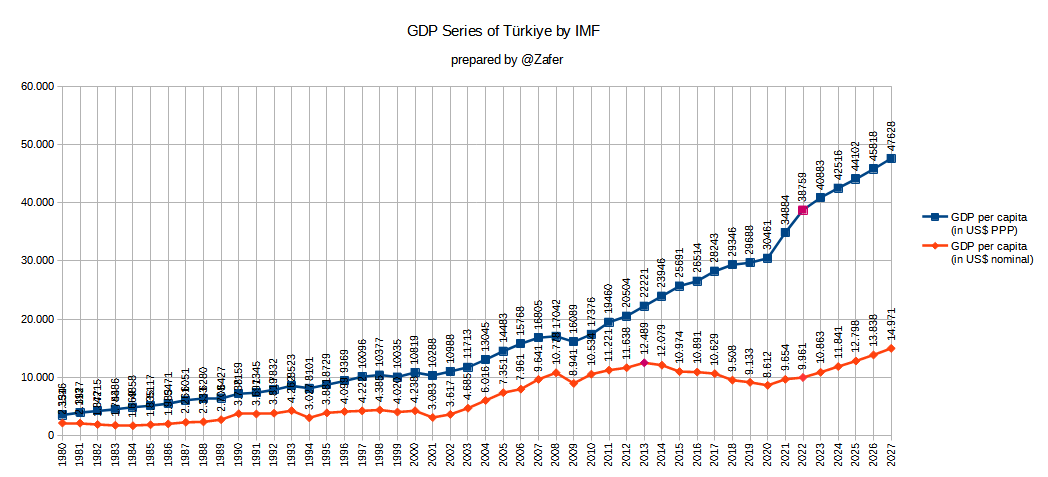 The truth about GDP of Türkiye with IMF numbers. Purchasing power keeps soaring while nominal GDP stagnates, affected by the war between lira ₺ and the dollar $.