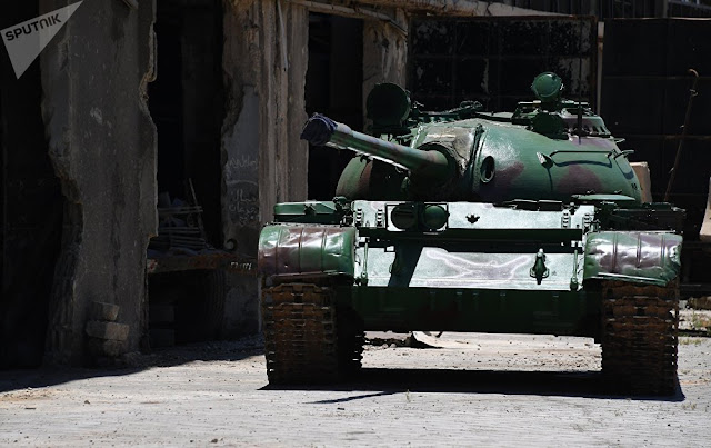 Three T-55As still in pristine condition stand guard outside the repair facility. Their good condition is a far cry from the T-55 above or most other T-55s still operational in Syria for that matter. While the vehicles might look ready to head out to the frontline, satellite imagery shows that these tanks were parked in the exact same location from 2015 to early 2018, making it likely they belonged to a resident unit that was tasked with defending the workshop and the area that surrounds it against possible attacks coming from rebel-held Jobar.
