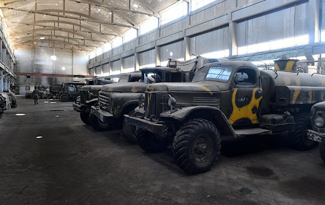 The workshop's motor pool quietly gathers dust in one of the storage halls of the facility. Having largely abandoned its aging fleet of Soviet trucks in favour of Russian-delivered GAZ, Ural and KamAZ trucks as well as more reliable and fuel-efficient commercially available vehicles, trucks like the ZIL-131, ZIL-157 and Ural-375 that once formed the backbone of the Syrian Arab Army's vehicle park now rust away in abandoned corners of SyAA bases all throughout Syria.