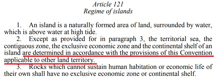 2. Islands have full rights to maritime zones, including an EEZ and continental shelf. Rocks that do not have their own economic life were excluded. They were given only territorial waters.