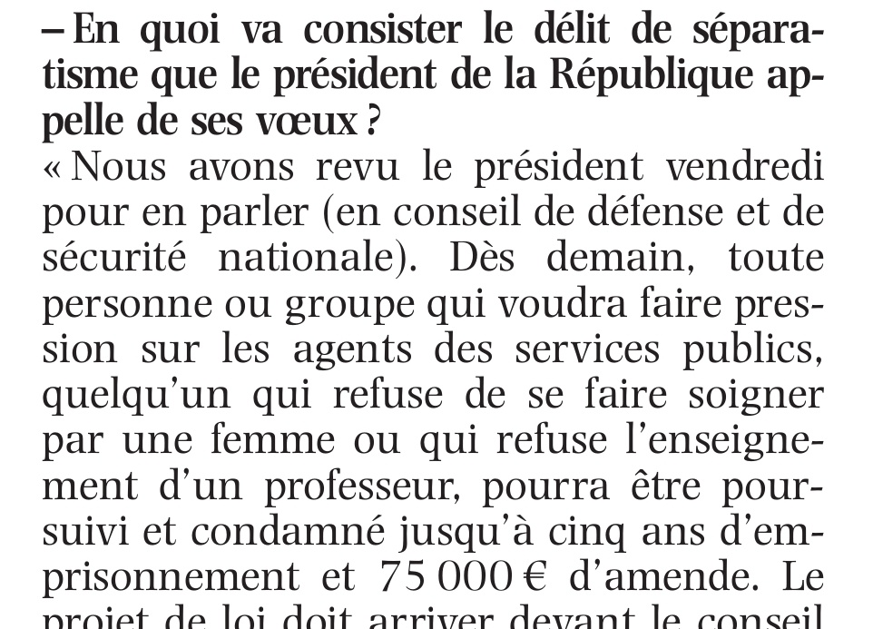 It is said anyone who puts pressure on public service agents,who refuse to be treated by a doctor of the opposite sexe or who refuse the teaching of a teacher for religious motives can be sued and sentenced to up to 5 years in prison and a fine of €75K.