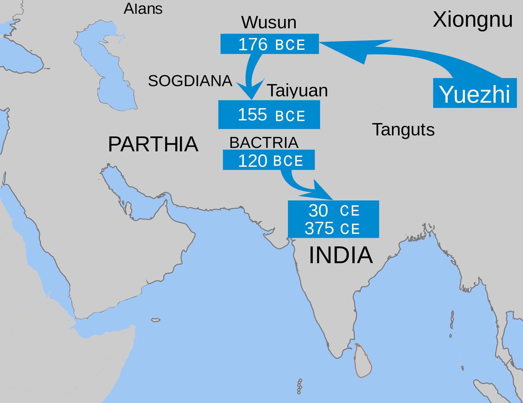 The Yuezhi, meanwhile, continually tracking the Saka-Pahlava (the Pahlava is a tribe that can be dealt with separately) created an empire that spanned vast areas in India and Central Asia, The Yuezhi were ruled by five clans, of which one, the Moon Clan, known in their native language as Kushana, grew to signify all the ruling classes, so their empire was known as the Kushana Empire. It was at this time that Buddhism spread through Central Asia, including the iconic caves of Bamian, and went through the trade connections of the Kushana with the Chinese to China, to make an impact there. The Kushana Empire lasted until it was overthrown by one of the Hunnish invasions, the first of them.
