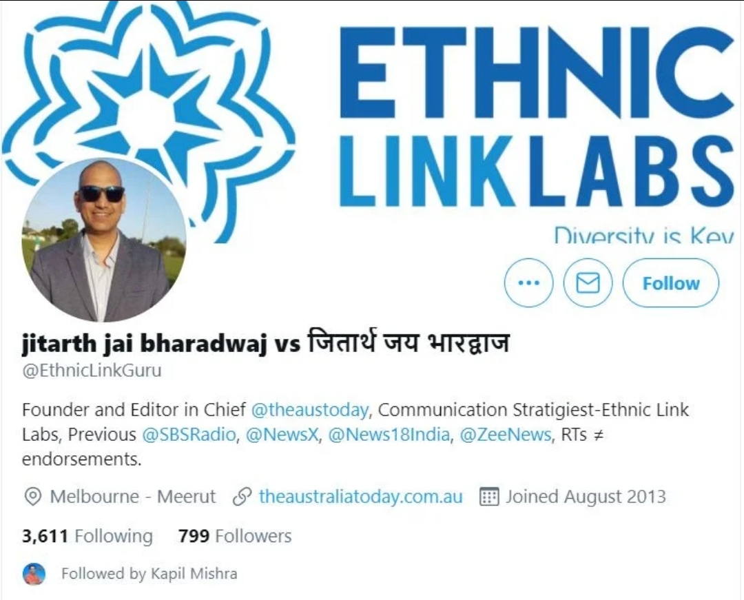The Twitter profile of Jitarth Jai Bhardwaj and found he is followed by Kapil Mishra. The bio also mentioned that he previously worked with NewsX, News18India, and Zee News.