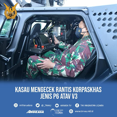 Dalam kegiatan ini, Kasau berkesempatan memeriksa perlengkapan Rantis P6 ATAV V3 yang akan digunakan oleh satuan Korpaskhas mulai dari persenjataan sampai sarana pendukung lainya.