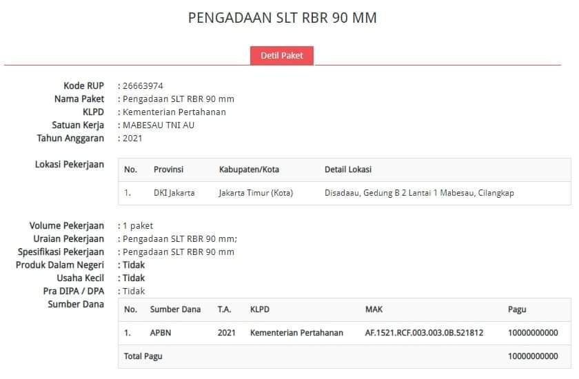 From lembaga keris, anti tank weapon 90 mm caliber. 10 Billion rupiah, around 714 thousand US Dollar. Not much in number i supposed only for Special force of Air Force and i can only think about Matador