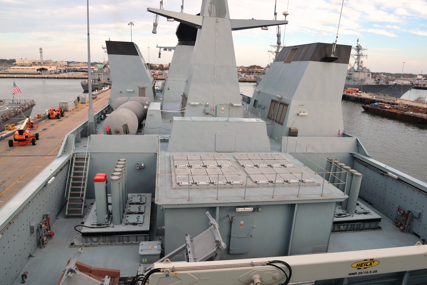 I have no idea how far that multi-deck access RHIB bay penetrates or whether Mk41 could be integrated in there or whether it would be feasible. Again the most viable option is to separate launchers.