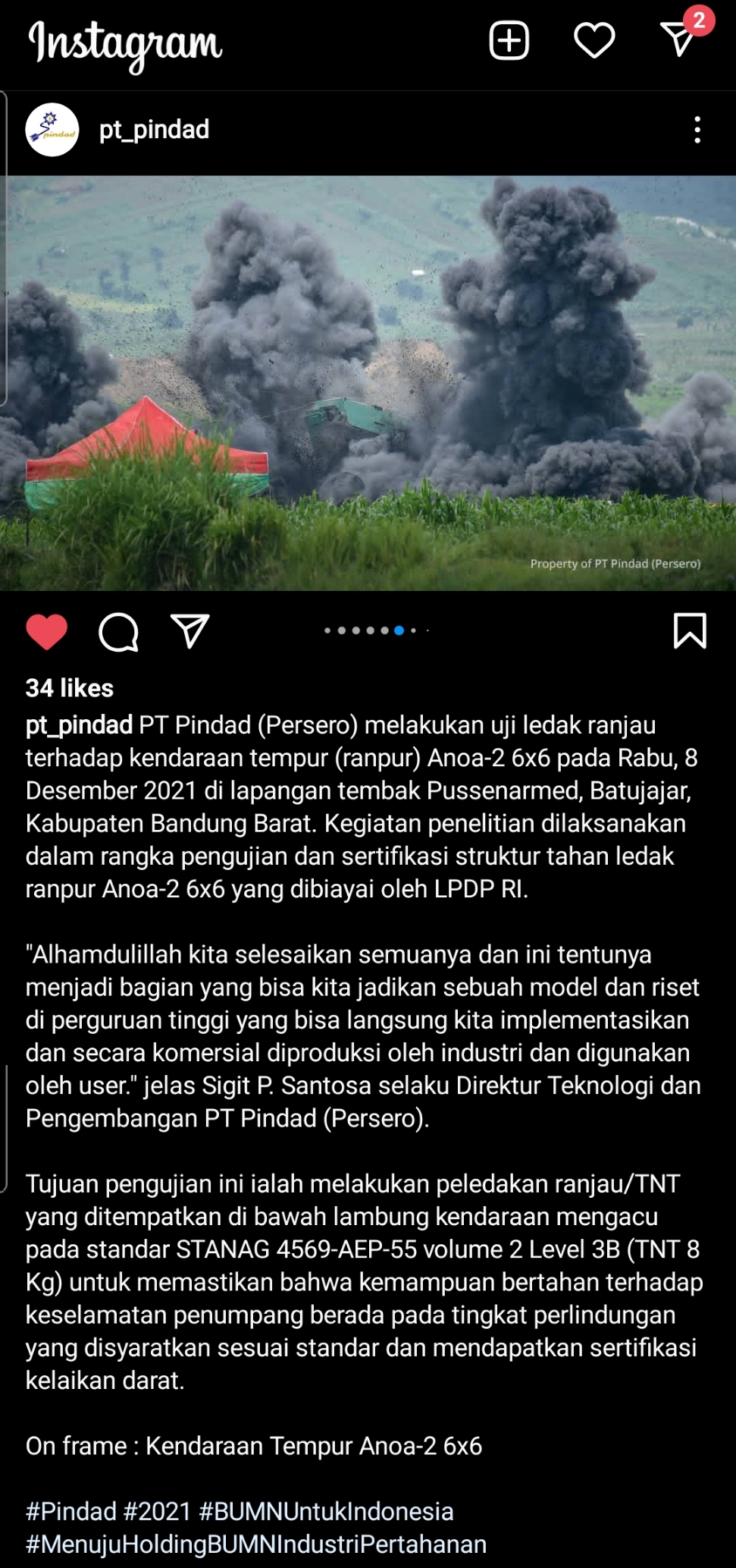 4,747 likes, 114 comments - pt_pindad on December 8, 2021: "PT Pindad (Persero) melakukan uji ledak ranjau terhadap kendaraan tempur (ranpur) Anoa-2 6x6 pada Rabu, 8 Desember 2021 di lapangan tembak Pussenarmed, Batujajar, Kabupaten Bandung Barat. Kegiatan penelitian dilaksanakan dalam rangka...www.instagram.com