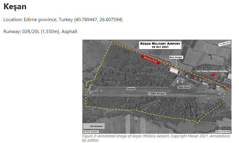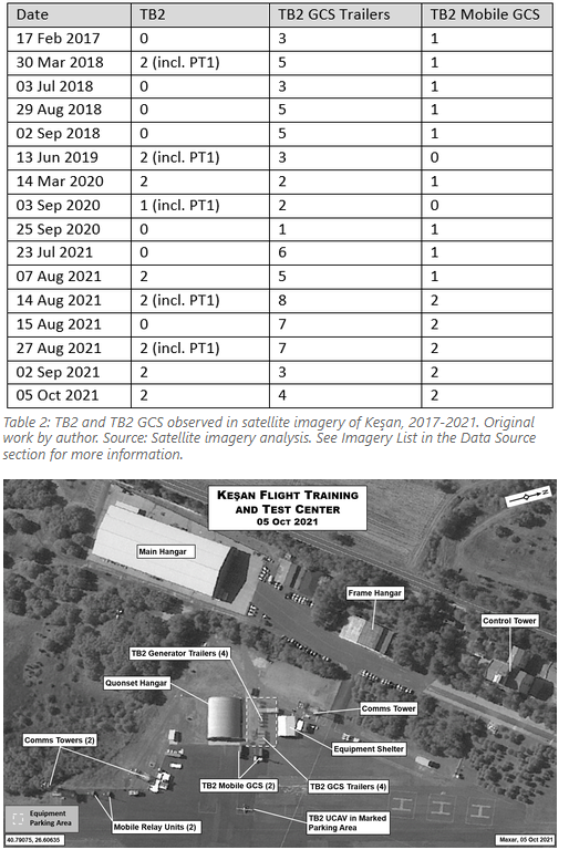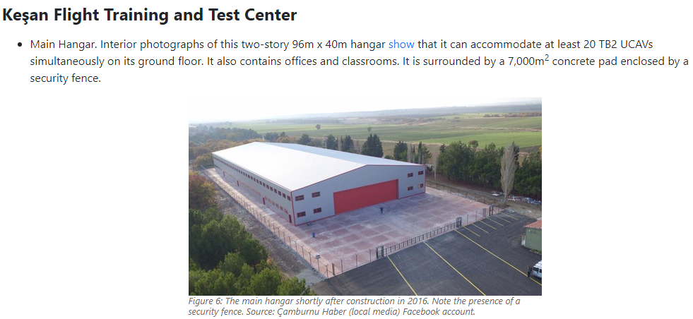 Keşan likely has the ability to store approximately 30 TB2 UCAVs in five hangars (see estimates below). One or two TB2 UCAVs have been visible in nine out of 16 satellite imagery captures of the airfield from 17 Feb 2017 to 05 Oct 2021, suggesting steady rotation of aircraft in and out of the hangars, with aircraft emerging shortly before they fly and returning afterwards.