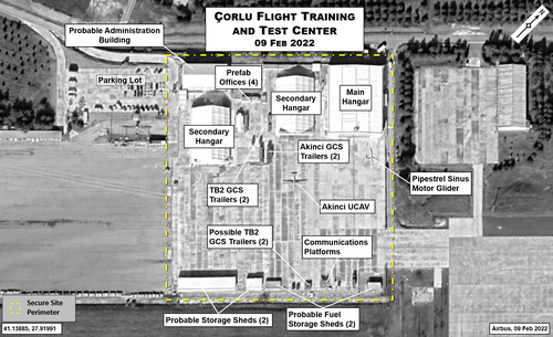 The three hangars within Çorlu Flight Training and Test Center can likely accommodate five to seven Akıncı UCAVs at once. If additional space is required, Baykar has been known to use the northern military apron as a parking area. Seven Akıncı were seen there in July 2022 for an “elephant walk” photoshoot. A pre-existing hangar on this apron can likely also host aircraft. No TB2 UCAVs have yet been identified in satellite imagery of Çorlu.