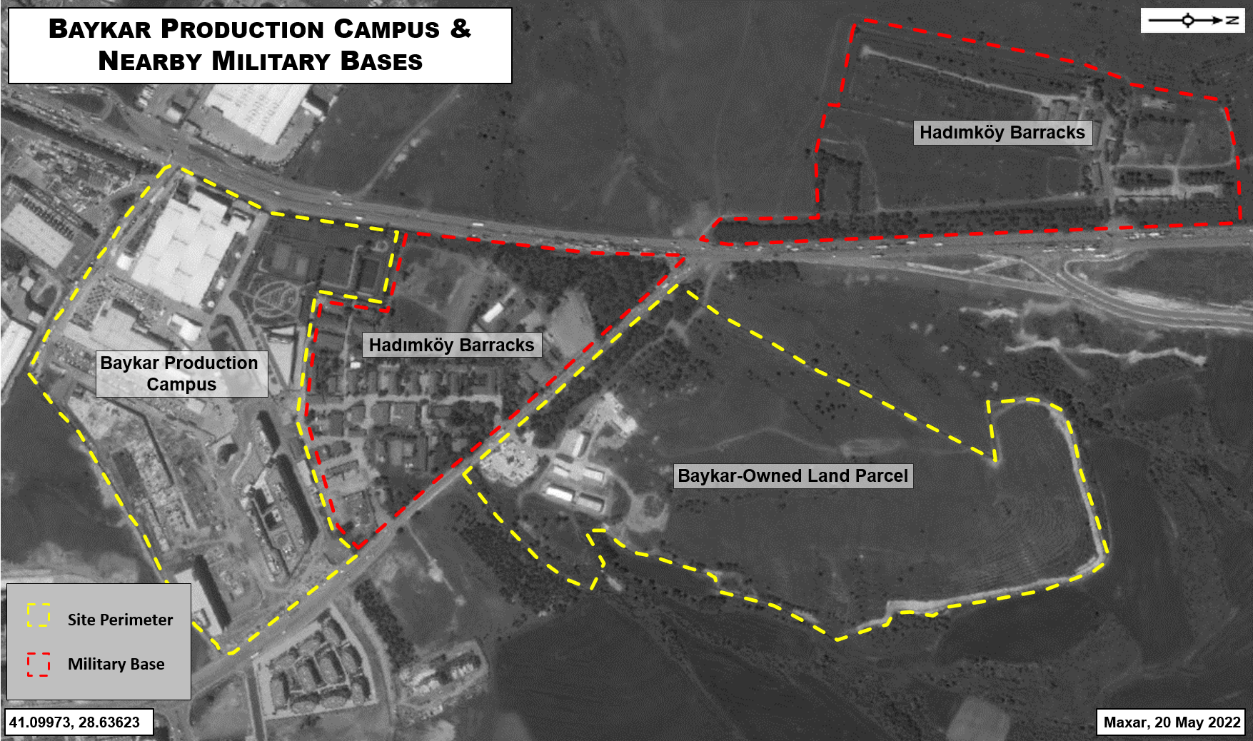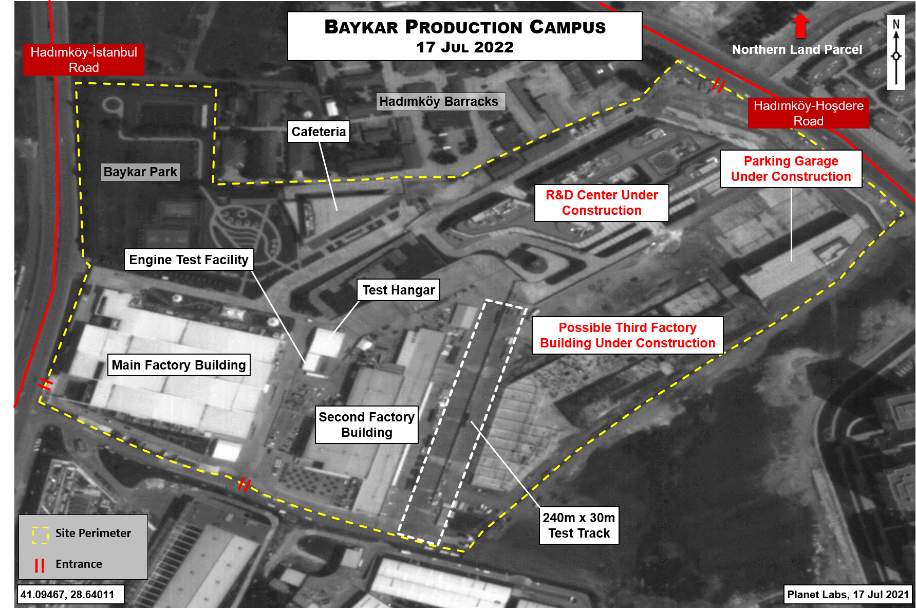 • A building with a foundation footprint measuring approximately 14,600m2. This is the most recent building to begin construction, between imagery dated 14 Jan 2022 and 20 May 2022, and the only one to remain unidentified. It is likely a third factory building. Haluk Bayraktar cited plans to create additional production space in Esenyurt on 29 Jan 2021, following the construction of the main and second factory buildings.