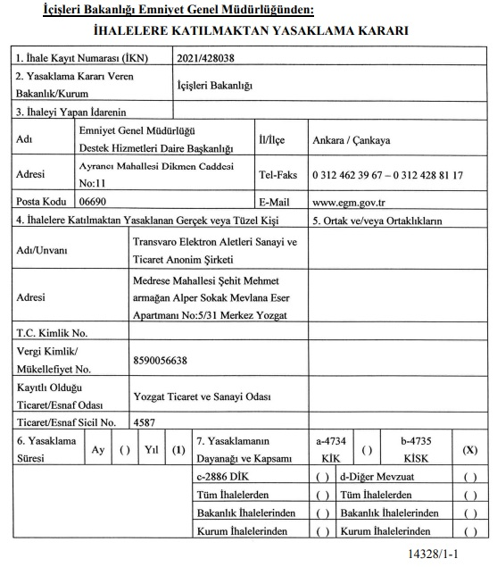 According to the information obtained from the Official Gazette dated 17 November 2022; Transvaro company, which operates in the field of defense industry, was banned from public tenders in line with the decision taken by the General Directorate of Security.
