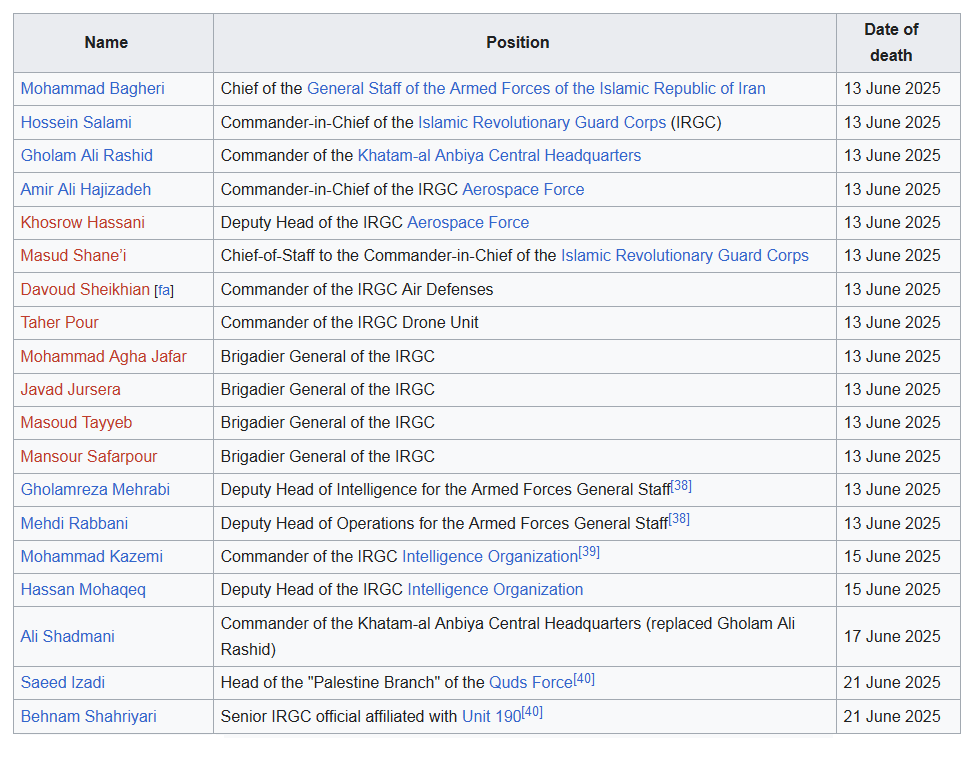 * 19 top military commanders eliminated (brigadier general and higher, including top of the top).