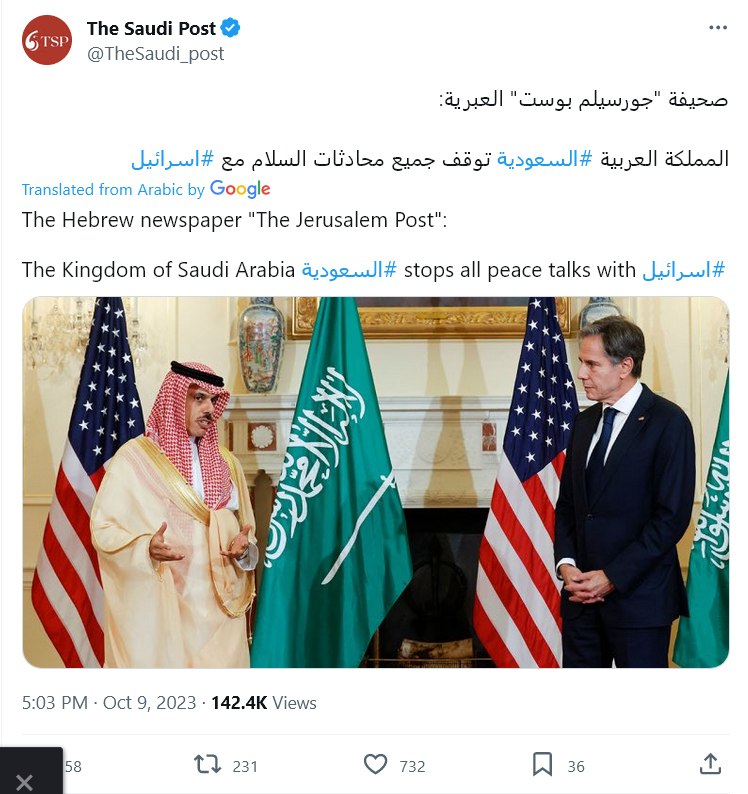 Source seems to be The Jerusalem Post Hebrew. Reported in Saudi media as well: