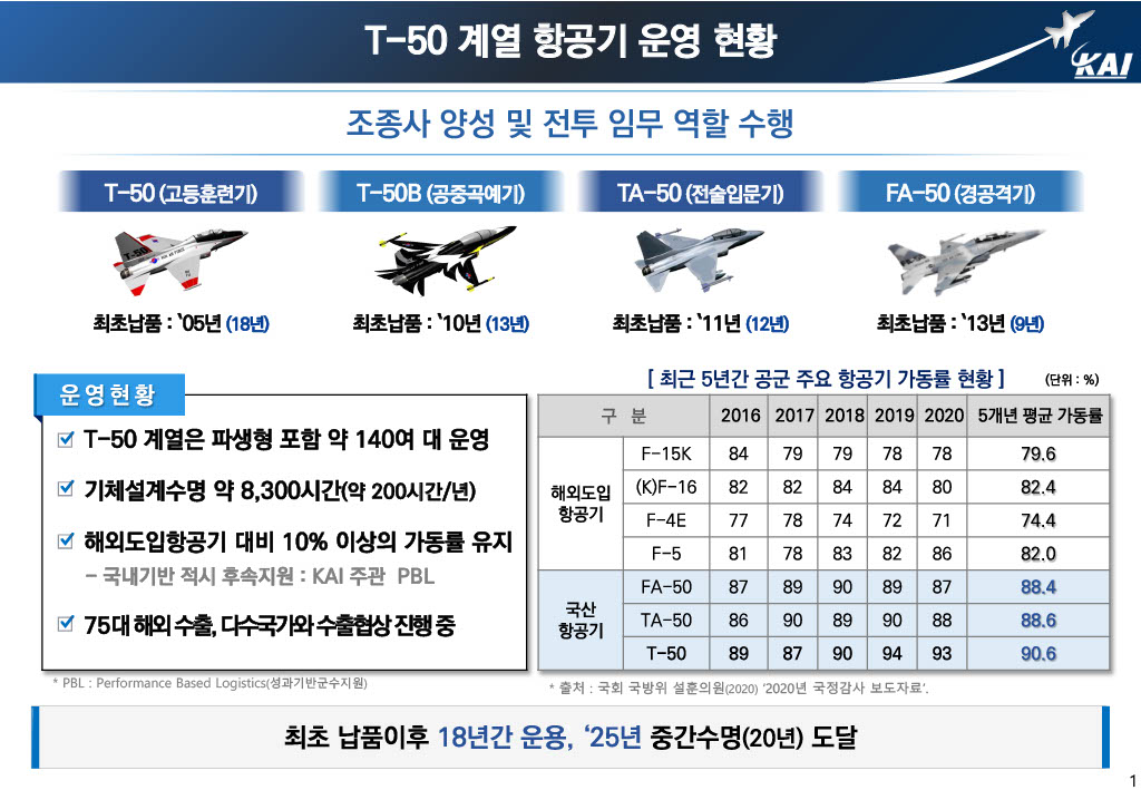 The T-50 family of aircraft has been in service for 18 years since it was first delivered to the Air Force and will reach mid-life (20 years) in 2025.