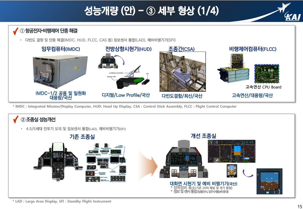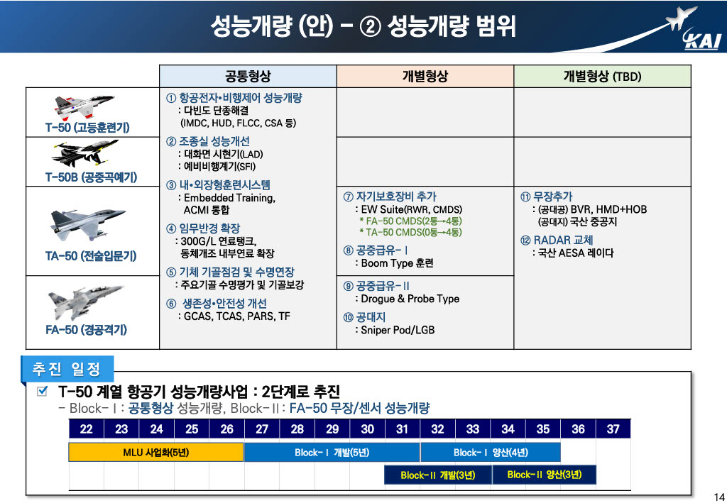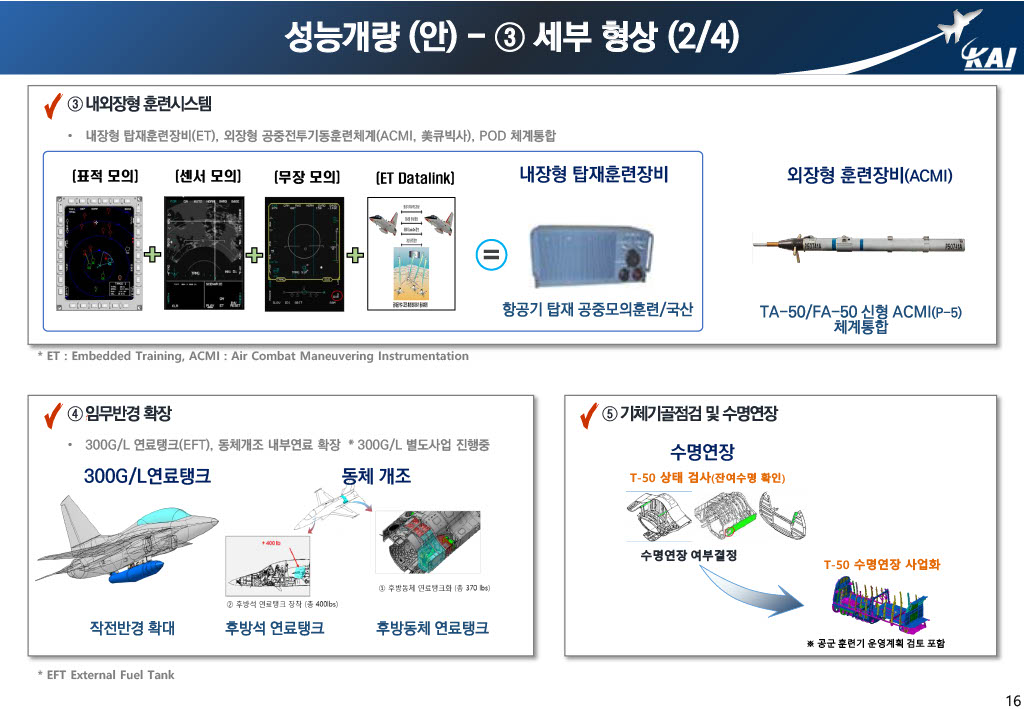 Therefore, KAI proposed a plan to integrate aviation avionics, FLCC, and embedded training systems in common with T/FA-50 to improve internal fuel expansion of the 300G/L external fuel tank integrated fuselage for mission radius expansion, gas life extension, GCAS, TCAS, PARS, and individually apply specific performance improvement factors.