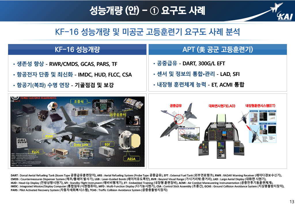 This part analyzes the requirements for improvements to the T/FA-50 by analyzing requirements from the KF-16 and the APT T-X program, a U.S. Air Force advanced training aircraft program. The KF-16 was upgraded to improve survivability, requiring protective equipment such as RWR/CMDS, GCAS, PARS, and TF, and to extend the life of the aircraft by modernizing aviation avionics, overhauling and reinforcing the airframe, while the APT T-X's requirements include aerial refueling capability, LAD, SFI, and integration of embedded training system capabilities.