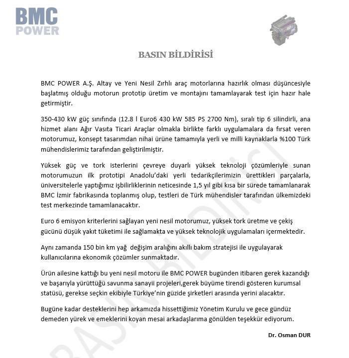 Based on the press release published 24.06.2018 by BMC Power; The prototype production and assembly of the commercial vehicle engine AZRA with a volume of 12.8 litre and a maximum power of 585 HP, which was developed to prepare for the YNHZA power group project, was completed and ready for testing.