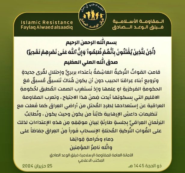 The brutal Turkish forces carried out a barbaric attack, occupied new villages, and terrorized the people of our beloved Iraq, without prior coordination with or knowledge of the central government. Astonished by the complete silence of the regional government, which by its silence supported this invasion, the Iraqi resistance expresses its readiness to expel the occupier from the lands of Iraq, as it did with ISIS terrorist organizations, whoever they are and wherever they are, and we call on the Iraqi parliament to hold an emergency session to clarify its position on these attacks.