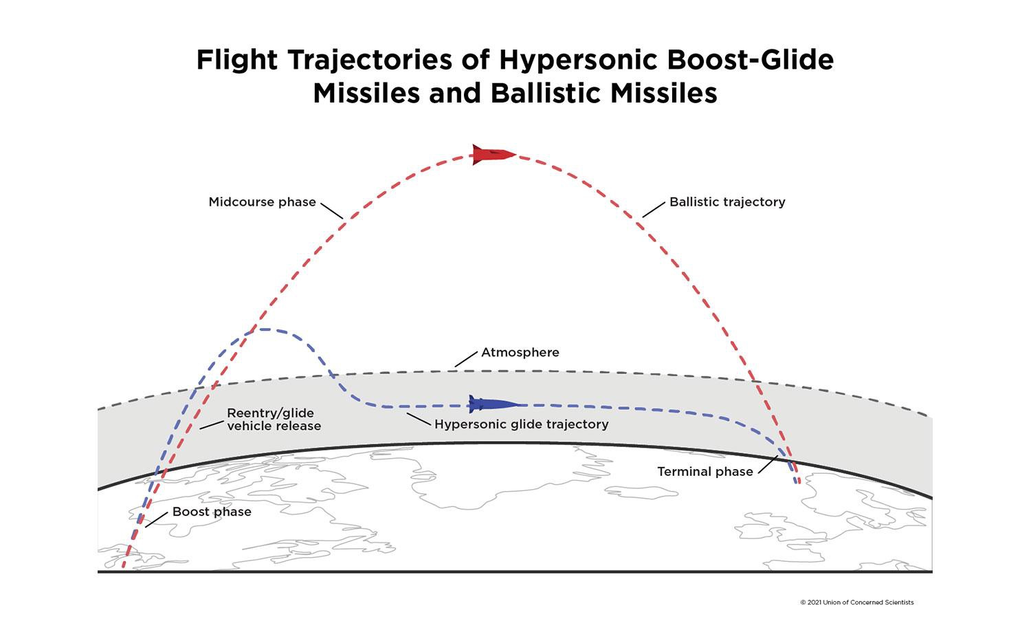 (blue line is the suppressed trajectory of a quasi ballistic missile. Red line is a ballistic missile trajectory)