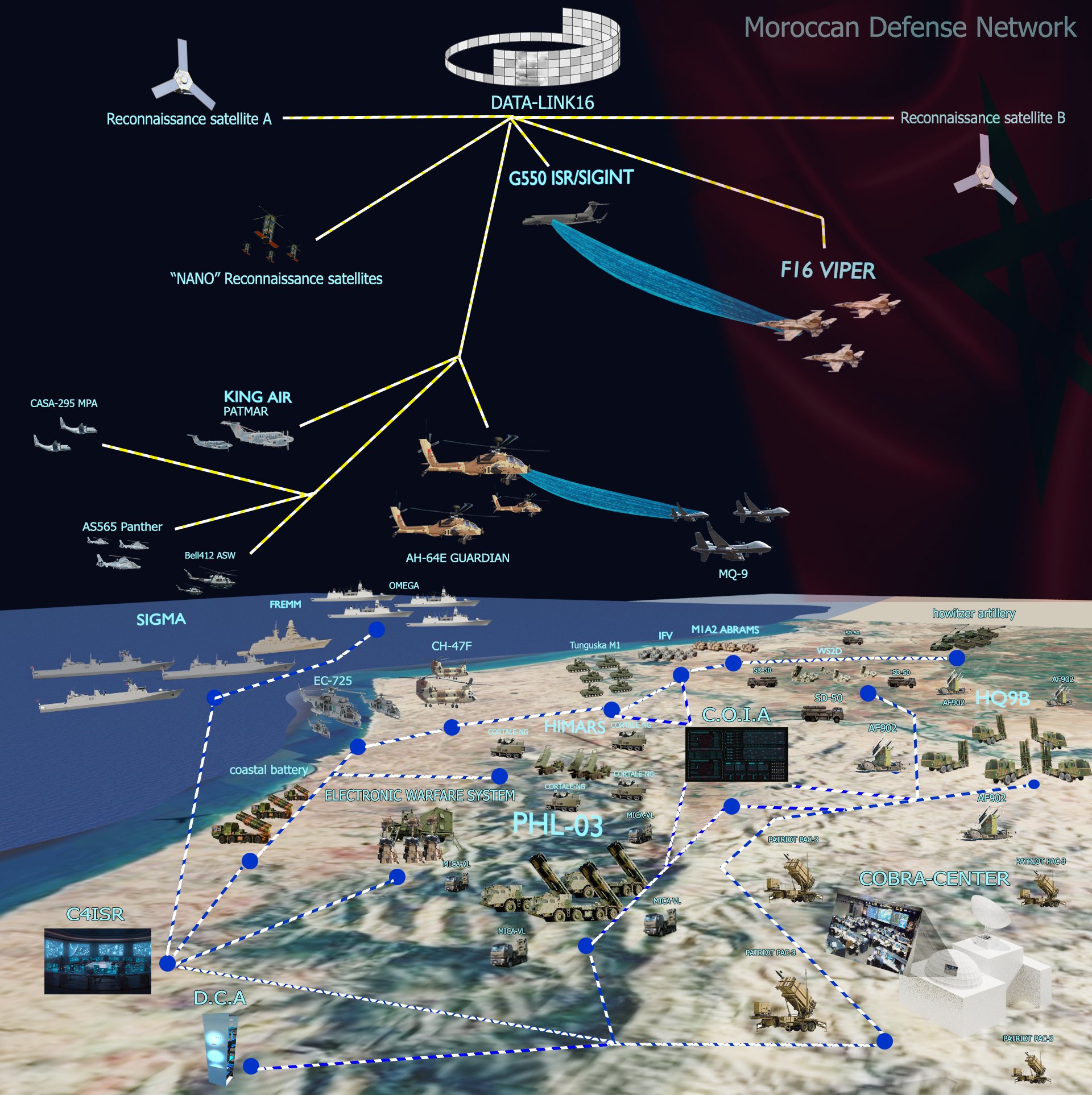 All the systems I have mentioned is compatible with the cobra center, and the network structure of the Moroccan armed forces will be fully matured with the arrival of the f16 vipers, apache AH64-E and the G500 ISR /SIGINT Aircrafts. We can therefore expect that the network will be matured by 2025.