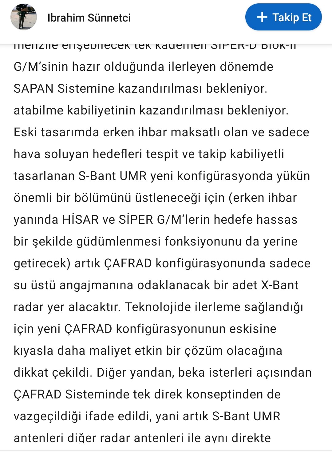 "S-Bant UMR yeni konfigürasyonda yükün önemli bir bölümünü üstleneceği için (erken ihbar yanında HİSAR ve SİPER G/M’lerin hedefe hassas bir şekilde güdümlenmesi fonksiyonunu da yerine getirecek)"