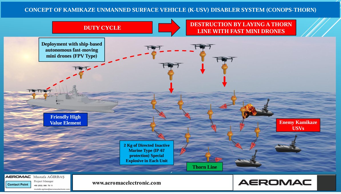 Similar concept can also be applied to USVs with canister launcher drones that could possibly have even longer range to hunt moving targets even further out from the ship.It seems that a smaller Turkish company has displayed some smart and cost effective solutions towards increasing threat of swarms of kamikaze USVs and rouge sea mines.