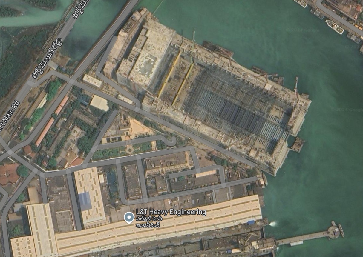 The new, larger dock (northern one) and the older, smaller dock that built Arihant and its Stretch versions (southern one, with the "L&T Heavy Engineering" pin on top)