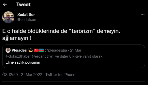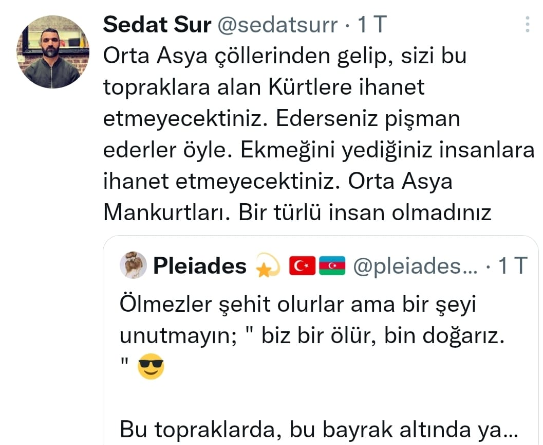 Mean while pan-kurdist pro hdp accounts are calling us Turks the ones who conquered these lands "Mongolians,Barbarians,Refugees from Central asia" and they are also talking against TSK but akp doesn't do anything against them the reason why we have these Disgusting creatures called pkk supporters is akps wrong policies humanism etc.