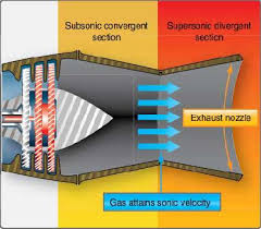 Here we have hot air exiting turbine where the yellow area is. The air is “converged” and constricted/choked at the throat to a high pressure to adjust mass flow rate. Before the throat the air flow is subsonic. At the throat the speed of air flow is Mach 1. But as it leaves the throat the air is released and gains speed. It becomes supersonic. This supersonic flow, thrusts the engine and the plane in the opposite direction towards supersonic speeds. By adjusting the throat convergence angle and also the opening angles of the divergence and the area of divergent nozzle, you can adjust the optimum state with which you can achieve supersonic flight.