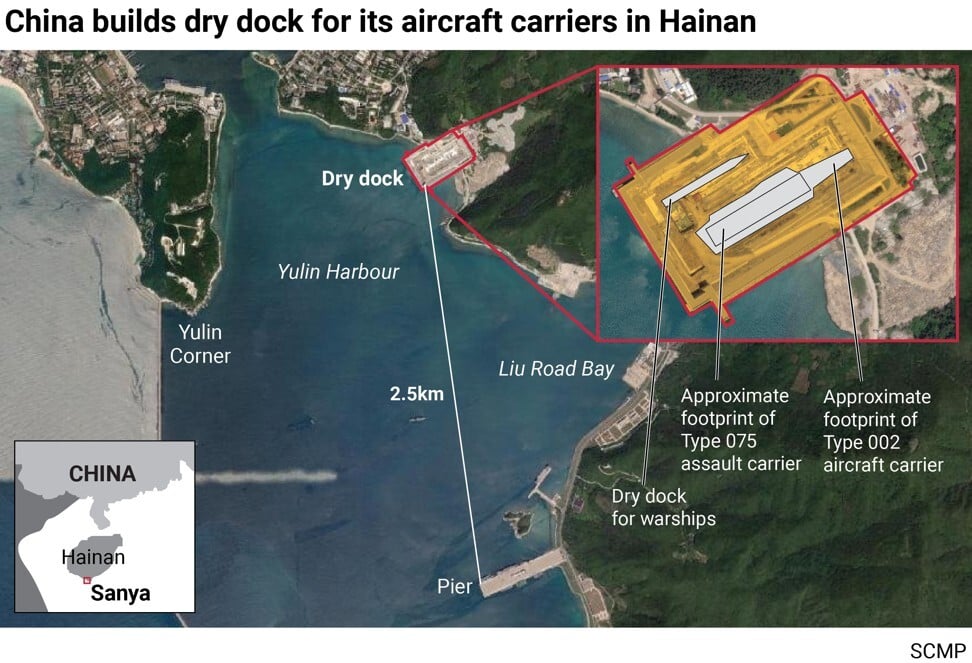 A dry dock being built at China’s naval complex on the island province of Hainan in the South China Sea will be big enough to accommodate the country’s new generation of