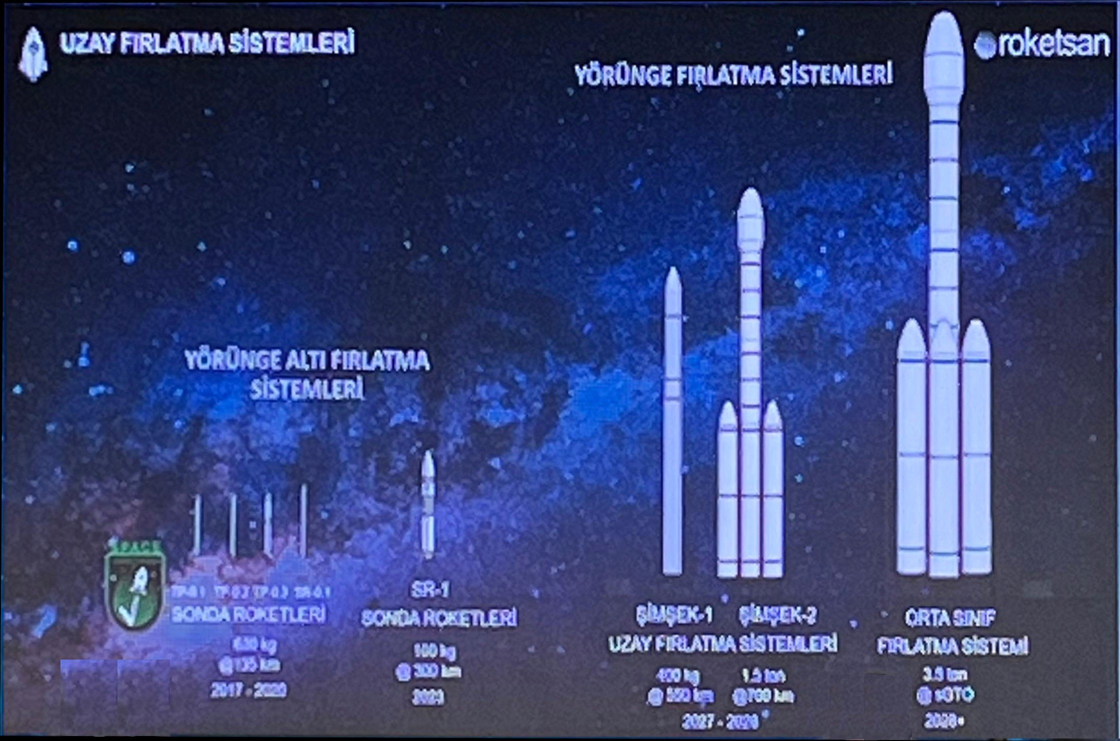Development of SLV and establishment of launch sites (High likely in Kirklareli) is in progress. This year, SR1 sounding rocket (100kg payload to 300km) will be launched into space.