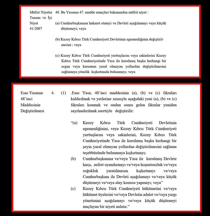 If these laws that Turkey "forces us to accept" passes, we won't be able to show dissatisfaction with president or government, we can't criticize government on social media, we won't be able to organize demonstrations without permission, we won't be freely use foreign money, TL will be forced ( I will not use any lira from now on!) government institutions will be sold to AKP gangs and many more.. We will be forced to learn your! way of religionwhich makes me more irritated than ever, so we are going to implement Turkey's rotten democracy..! wonderful.. Obey or leave, this is what is said by so called savior of Turkish Cypriots now.. probably next step will be annexation, If that happens I hope whole world sanctions Turkey worse than Russia, this is my country and I won't leave it and I will live my life with my rules..