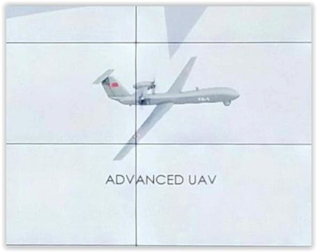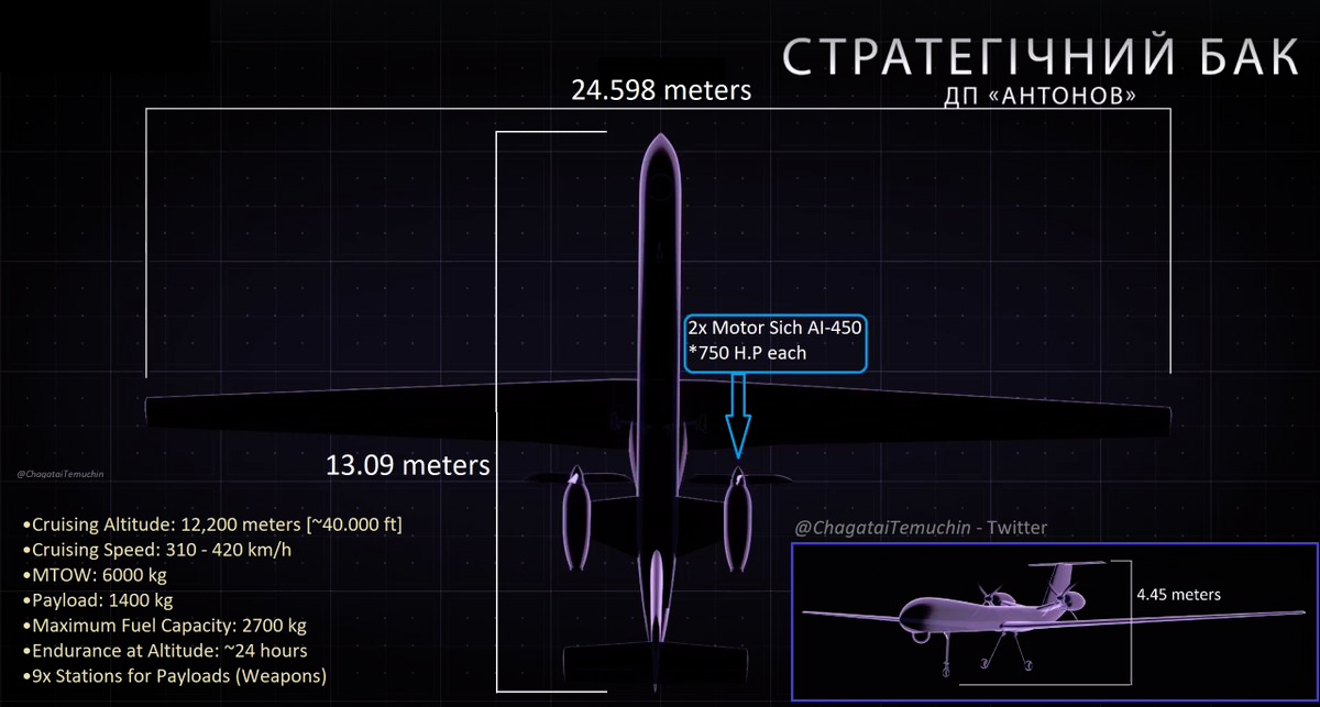 The Advanced UAV can carry almost as twise as the useful load of Aksungur. It is reported to be able to carry 1.400kg of payload, have a cruise altitude of ~40.000ft and ~24 hours endurance. Also will have more hard points for different types of loads. On the picture below we see Antonov's vision and we can clearly see Cirit and SOM. I am not sure if the figure about the payload is external+internal payload or only external. If we assume that the figures are pointing at external payload with it's 9 hard points it could probably be able to carry something like 1xSOM-J, 2xTEBER-81, 4xCIRIT, 4xUMTAS/L-UMTAS.