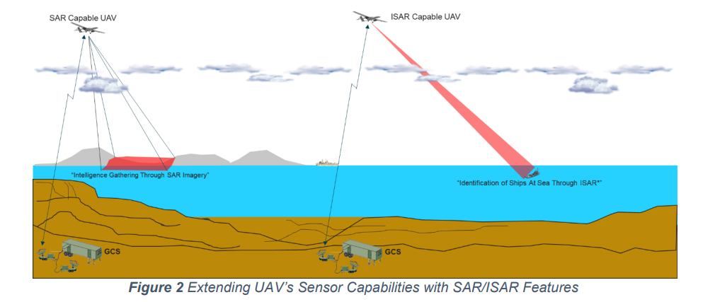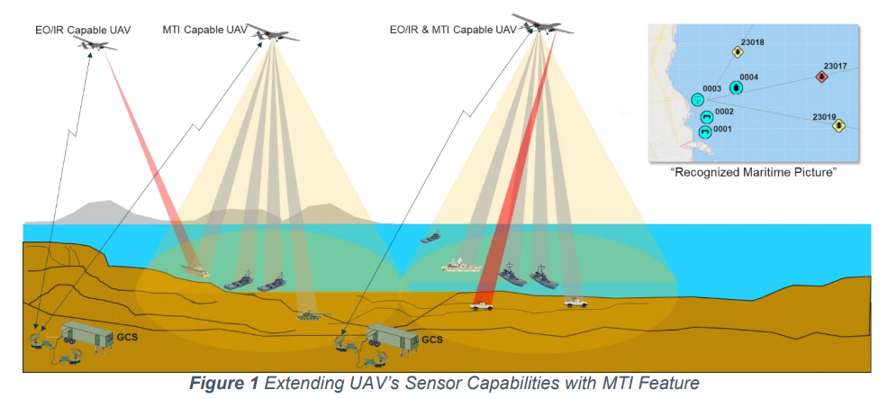Operators try to identify military units in the battlefield through the usage of various types of sensors. Identification Friend or Foe (IFF), Automatic Identification System (AIS) sensors support the identification process for the cooperated targets. On the other hand, EO/IR cameras, Electronic Support Measures (ESM) systems, and radar systems are used in the process of identifying non-cooperated targets. In that sense, SAR/MTI radars could significantly increase the identification performance for the stationary and moving targets by means of evaluation of radar imagery (SAR and ISAR) and moving target indicators. Although EO/IR sensors are the major identification tool for the surveillance platforms, the most of them including Unmanned Aerial Vehicles (UAVs) carry only EO/IR sensors which remarkably limit the platform’s search capability due to their limited field of view. Radar systems’ MTI feature provides round-the-clock situational awareness by shortening and enhancing the target detection process. If the detection and tracking process is implemented only with EO/IR sensors, it is obvious that the target detection and tracking is degraded due to the high-speed targets, being inside or over the cloud, and low visibility situations. These detection and tracking difficulties could be overcome by collectively using EO/IR sensor and SAR/MTI radar. Theoretically, this type of usage provides a robust solution to the detection and tracking cases for the moving and stationary targets. This theoretical approach comes with some practical limitations including UAV’s payload capacity and budgetary problems. Low SWaP (Size, Weight, and Power), single LRU and lowcost SAR/MTI radars could turn an air vehicle such as a limited-capacity tactical UAV into a highly capable ISR (Intelligence, Surveillance, and Reconnaissance) platform. MTI Feature As depicted in Figure 1, EO/IR capable UAV has a limited search capability. In contrast, MTI capable UAV has a 360-degree search capability including Ground Moving Target Indication (GMTI) and Maritime Moving Target Indication (MMTI). If these two types of UAVs are jointly operated, detection-tracking-identification process could be implemented even with low-cost tactical UAVs. MTI capable UAV detects the moving targets on the surface and then Ground Control Station (GCS) may automatically directs the EO/IR capable UAV to the detection location for identification. In the second alternative, it is possible to have onboard EO/IR sensor and MTI radar which should be selected in accordance with the tactical UAV’s payload capacity. MTI to EO/IR cueing mechanism is triggered by the sensor operator on GCS.