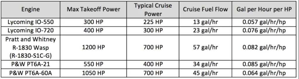 Closer inspection however reveals that the specific fuel consumption or Gal/Hr/HP value favors the IO-550 and the PT6A-60A. At the extremes of the power output ranges, efficiency is dramatically improved, the engines burn less fuel per hour to generate a given power output.